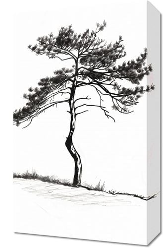 Obraz z serii minimalistyczne zatytułowany Samotna Sosna. Grafika ukazuje samotne, majestatyczne drzewo sosnowe, którego wygięte gałęzie opowiadają historię wielu lat stawiania czoła niewidzialnym siłom natury. Drzewo wyrasta smukłe, z charakterystycznym skrzywieniem, jakby w pozie tańca z wiatrem, a jego korona jest gęsta i dzika, malowana ekspresyjnymi pociągnięciami pędzla. Cień drzewa rysuje na ziemi delikatne wzory, dodając głębi kompozycji i zachęcając do refleksji nad przemijaniem i siłą życia.Ten obraz będzie pięknym dodatkiem do wnętrz, które pragną nawiązać do natury i wprowadzić element kontemplacyjny. Idealny do pomieszczeń, które cenią prostotę i głębię, takich jak medytacyjne kąciki, spokojne biblioteki lub minimalistyczne salony. Jego uniwersalna estetyka sprawia, że pasuje zarówno do nowoczesnych, jak i bardziej tradycyjnych przestrzeni.