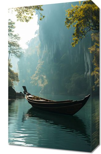 Obraz z serii pejzaże zatytułowany Samotność na Tafli przedstawia idylliczny krajobraz, w którym centralnym punktem jest drewniana łódka unosząca się na spokojnych wodach jeziora. Otoczona przez majestatyczne, zielone drzewa i klify, które otulają wodę jak opiekuńcze ramiona, scena ta jest utrzymana w ciepłych, naturalnych barwach. Promienie słoneczne przebijają się przez liście, tworząc efekt tajemniczego światła i cieni na wodnej tafli. Całość kompozycji wywołuje uczucie spokoju i kontemplacji, idealnie oddając atmosferę zacisznego zakątka, oderwanego od zgiełku codzienności. Obraz ten będzie pasował do wnętrz, które pragną podkreślić łączność z naturą i stworzyć oazę spokoju, takich jak gabinety relaksacyjne, pokoje medytacyjne czy nawet jako spokojny akcent w nowoczesnych biurach.