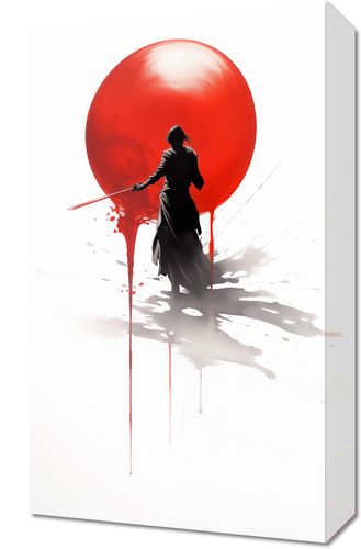 Obraz z serii motywy wschodnie zatytułowany Samotny Samuraj przedstawia postać w tradycyjnym japońskim stroju, samuraja, w dynamicznej pozie z mieczem, z potężnym, czerwonym słońcem w tle. Design wykorzystuje silne kontrasty kolorystyczne - biel i czerń z akcentami czerwieni, aby stworzyć dramatyczną i potężną wizualizację. Przedstawienie samuraja w akcji z rozpryskami tuszu naokoło podkreśla ruch i energię, a jednocześnie oddaje hołd tradycyjnym technikom japońskiego malarstwa atramentem. Ten obraz to doskonały wybór dla miłośników japońskiej kultury i sztuk walki, idealny do wnętrz nowoczesnych jak i tych o bardziej klasycznym charakterze.