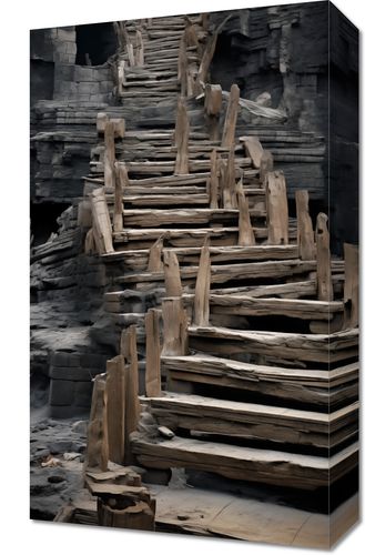 Obraz z serii pejzaże zatytułowany Schody do Nieznanego. Ten tajemniczy i intrygujący obraz przedstawia prymitywne, drewniane schody prowadzące w górę przez strukturę przypominającą starożytną ruiny lub naturalne formacje skalne. Zanurzone w półmroku, schody te wydają się zapraszać odkrywców do podjęcia podróży w nieznane, pełnej nieoczekiwanych odkryć. Obraz ten idealnie oddaje uczucie odkrycia i przygody, idealny dla przestrzeni zainspirowanych historią, naturą, czy literaturą eksploracyjną. Może stanowić inspirujący element w domach, biurach, a także w przestrzeniach publicznych takich jak kawiarnie tematyczne lub księgarnie.