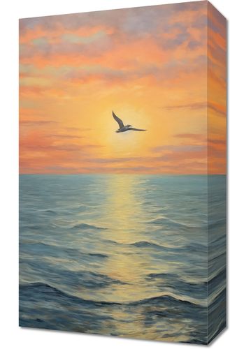 Obraz z serii pejzaże zatytułowany Serenada Nieba. Ten olśniewający obraz przedstawia moment, gdy ostatnie promienie dnia malują niebo w odcienie pomarańczy i różu, a pojedynczy ptak szybuje w stronę zachodzącego słońca. Morze rozciąga się aż po horyzont, odbijając złote światło, które nadaje scenie poczucie nieskończoności i spokoju. Doskonale nadaje się do wnętrz, które aspirują do stworzenia atmosfery spokoju i refleksji, takich jak salony, pokoje wypoczynkowe, czy przestrzenie wellness i spa.