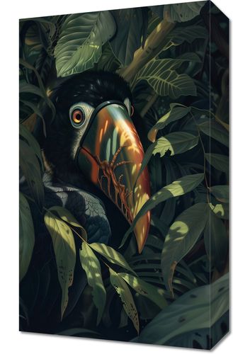 Obraz z serii natura zatytułowany Skryty Tukan przedstawia zaskakujący i intensywny portret tukana, zanurzonego w gęstej, tropikalnej zieleni. Ptak ma swoje charakterystyczne, kolorowe dziob w odcieniach pomarańczy i czerni, który odbija światło, tworząc efekt lustrzanego odbicia. Jego przenikliwe oko, obserwujące widza, dodaje głębi i charakteru kompozycji. Otaczające go rośliny są pełne detali, z subtelnymi gradiencjami kolorów i światłocieni, co tworzy efekt trójwymiarowości i ukrycia. Ta ilustracja emanuje tajemnicą tropikalnego lasu, gdzie natura i dzikie zwierzęta współistnieją w delikatnej równowadze. Obraz ten jest idealny dla przestrzeni, które cenią sobie piękno natury i chcą wprowadzić element dzikiej, nieujarzmionej przyrody do swojego otoczenia.