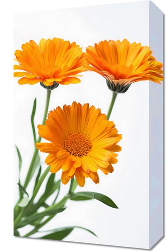 Obraz z serii wnętrza zatytułowany Słoneczne Kalendule. Zaprezentowano na nim trzy jaskrawe, żywiołowe kwiaty kalenduli, które rozkwitają na tle czystej bieli. Ich intensywnie pomarańczowe płatki i wyraziste, bogate środki stanowią symbol radości i optymizmu. Delikatne cienie i gra światła na płatkach dodają głębi i realizmu, sprawiając, że kwiaty wydają się niemal trójwymiarowe. Ten obraz może wprowadzić element natury i świeżości do każdego wnętrza, będąc idealnym wyborem dla przestrzeni, które cenią sobie jasność i lekkość, takich jak salony, pokoje relaksacyjne czy kliniki wellness.