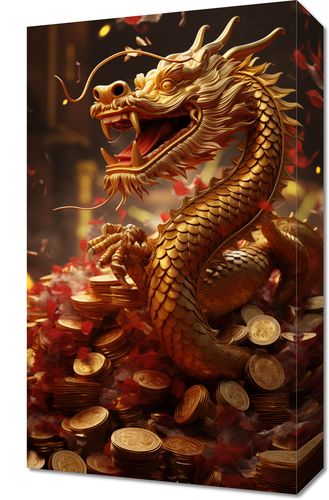 Obraz z serii motywy wschodnie zatytułowany Smok Bogactwa. Ilustracja ta ukazuje potężnego złotego smoka, symbol siły i pomyślności w wielu kulturach wschodnich, unoszącego się nad skarbami. Smok, z szeroko otwartymi szczękami, wydaje się ryczeć triumfalnie, otoczony przez wirujące złote monety i kwiaty, co dodaje kompozycji dynamizmu. Żywe kolory i szczegółowe wykonanie smoka sprawiają, że obraz jest pełen życia i energii. Obraz ten jest doskonałym wyborem dla miłośników sztuki orientalnej oraz jako element dekoracyjny wnętrz, które chcą wprowadzić elementy bogatej symboliki i kulturowej głębi, takich jak domowe biura, pokoje do medytacji czy ekskluzywne salony.