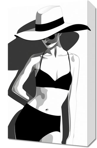Obraz z serii abstrakcja zatytułowany Strój. Prezentuje stylizowany czarno-biały wizerunek kobiety w dwuczęściowym stroju kąpielowym. Postać odziana jest w szerokobrzmiony kapelusz, który rzuca cień na jej twarz, podkreślając elegancki i tajemniczy charakter kompozycji. Kobieta stoi w pozycji trzy czwarte, z jedną ręką opuszczoną wzdłuż ciała, a drugą lekko zgiętą w łokciu, co dodaje dynamizmu ilustracji. Obraz jest utrzymany w minimalistycznym stylu z wykorzystaniem płaskich plam kolorów i wyraźnych linii, co nadaje mu nowoczesny i modny wygląd. Ten rodzaj grafiki idealnie wpasuje się w nowoczesne wnętrza, szczególnie te o monochromatycznej kolorystyce, lub jako modny akcent w przestrzeniach o minimalistycznej estetyce.