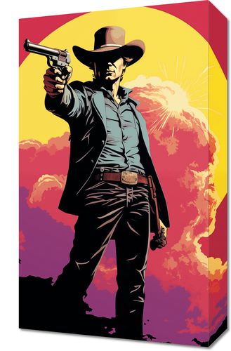 Obraz z serii pop art zatytułowany Strzelec z Epoki. Ten obraz przedstawia postać klasycznego kowboja w akcie wystrzału, z tłem wschodzącego słońca, które rozświetla scenę w ciepłych odcieniach czerwieni i pomarańczy. Silny kontrast i zdecydowane linie wydobywają charakterystyczne cechy postaci, od kapelusza po detale na szelkach i pasie. Obraz ten jest hołdem dla kultury westernów i bezkresnych amerykańskich przestrzeni, idealny dla miłośników historii i kinematografii, a także jako wyrazisty element dekoracyjny w miejscach takich jak domy, bary tematyczne lub sale kinowe.