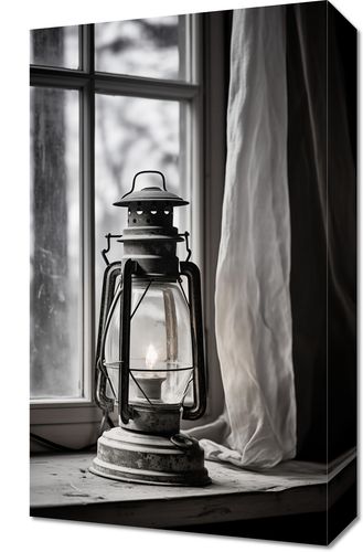 Obraz z serii wnętrza zatytułowany Światło Wspomnień. Na tym nastrojowym zdjęciu widzimy klasyczną latarnię naftową umieszczoną na parapecie przy oknie, przez które prześwituje delikatne światło zimowego dnia. Monochromatyczna paleta barw oraz subtelne detale takie jak rdzawe ślady na latarni i lekko zmierzwiona zasłona nadają głębi i charakteru. Ten obraz to sentymentalny powrót do czasów, kiedy blask świecy był codziennością, a każde źródło światła miało swoją historię. Idealny do wnętrz urządzonych w duchu nostalgii, takich jak rustykalne domy, klasyczne biblioteki, lub jako akcent w nowoczesnych przestrzeniach, wprowadzający element kontrastu i ciepła.