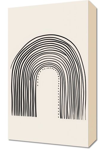 Obraz z serii boho zatytułowany Symetria Łuku. Grafika jest kwintesencją graficznej symetrii, przedstawiając hipnotyzujący motyw łuków, który wyłania się z rytmicznie powtarzających się, czarnych linii na beżowym tle. Kompozycja w formie bramy składa się z koncentrycznych półkoli, tworząc głęboką perspektywę, która przyciąga wzrok i prowadzi go ku centralnej, tajemniczej przestrzeni. Delikatne kropki podkreślają ścieżkę prowadzącą do wewnętrznego centrum, sugerując podróż ku własnej introspekcji. Ten minimalistyczny obraz będzie pasował do wnętrz o współczesnym charakterze, gdzie jego klarowna estetyka może stanowić przeciwwagę dla zgiełku codzienności, a także do przestrzeni w stylu zen, gdzie może wspomagać medytację i spokój umysłu.