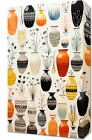 Obraz z serii wnętrza zatytułowany Symfonia Wazonów. Wspaniałe wazony w bogatej palecie kolorów, od głębokiej czerni do ciepłych odcieni pomarańczu, tworzą intrygującą mozaikę wzorów i kształtów. Delikatne motywy roślinne, które zdobią niektóre wazony, dodają uroku i lekkości, a różnorodność wzorów i faktur przyciąga wzrok i zaprasza do głębszej refleksji. Kontrast między jasnymi i ciemnymi barwami, a także subtelne niuanse w każdym wazonie, dodają tej kompozycji głębi i dramatu. Ten artystyczny plakat doskonale wpisuje się w klimat wyrafinowanych galerii sztuki, eleganckich kawiarni oraz nowoczesnych przestrzeni mieszkalnych, które stawiają na unikatowy design.