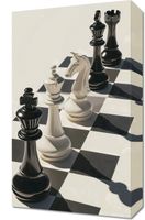 Obraz z serii abstrakcja zatytułowany Szach i Mat. Na obrazie widzimy fotorealistyczną kompozycję szachów w akcji. Białe i czarne figury są elegancko rozmieszczone na szachownicy, co sugeruje intensywność i strategię gry. Cienie rzucone przez figury na błyszczącą powierzchnię szachownicy nadają głębi i trójwymiarowości obrazu. Skupienie na kilku głównych figurach, takich jak wieża, hetman i skoczek, może symbolizować krytyczny punkt w grze, gdzie każdy ruch ma kluczowe znaczenie. Tło jest jasne i neutralne, co pozwala skupić się na dynamice gry bez rozpraszających elementów. Obraz ten mógłby być idealnym dodatkiem do przestrzeni dla miłośników szachów lub jako dekoracyjny element w przestrzeni wspólnej, bibliotece lub pokoju gier, dodając elegancji i intelektualnego charakteru.