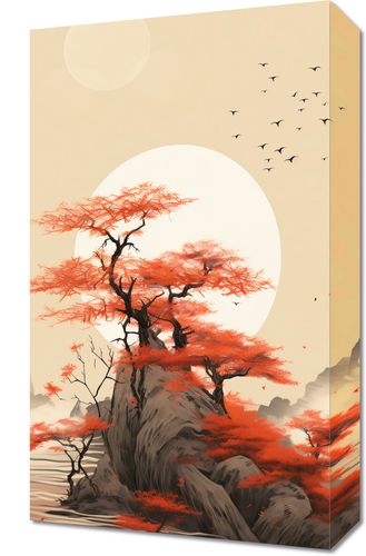 Obraz z serii pejzaże zatytułowany Szepty Wiatru. Niesamowity krajobraz z jaskrawo czerwonymi drzewami rosnącymi na majestatycznej skale, której kształty wydają się być ukształtowane przez wieki. Błyszczący biały księżyc oświetla spokojne wody, które otaczają skale, podczas gdy stado ptaków przenika przez jasne niebo, dodając uczucie przestrzeni i nieskończoności. Subtelne odcienie szarości i biele w tle tworzą kontrast dla wyrazistych czerwieni drzew, nadając scenie głębię i dramatyzm. Idealny do ozdoby salonów medytacyjnych, gabinetów terapeutycznych lub luksusowych hotelowych holów.
