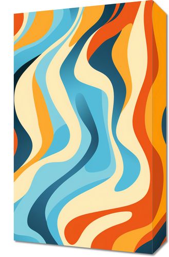 Obraz z serii abstrakcja zatytułowany Tańczące Fale. Kolorowe pasma falujące w rytmie niewidzialnej melodii, tworząc kalejdoskop błękitów, pomarańczy i beżów. Te meandryczne wzory przypominają wodne tanecznice, które wirowałyby w rytmie letniego brzasku. Ciepłe i chłodne tony kontrastują ze sobą, nadając obrazowi głębi i dynamiki. Będzie idealnym wyborem dla nowoczesnych apartamentów nad morzem, czy też kawiarni o śródziemnomorskim klimacie.