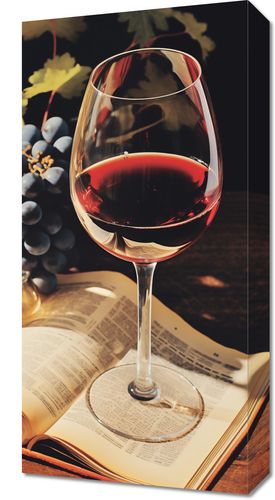 Obraz z serii wnętrza zatytułowany Bukiet Historii. Na tej zachęcającej ilustracji widzimy kieliszek czerwonego wina delikatnie spoczywający na otwartej stronie książki, z wyraźnym odbiciem na stronach. Obok kieliszka umieszczono grono dojrzałych winogron, a całość kompozycji znajduje się na ciemnym tle, co podkreśla bogactwo i głębię barw. Ten obraz oddaje przyjemność płynącą z połączenia relaksującej lektury z degustacją wybornego wina, idealny dla miłośników dobrych książek i enologii, świetnie sprawdzi się w domowych biblioteczkach, salonach degustacyjnych czy jako wyrafinowana dekoracja w winiarniach.