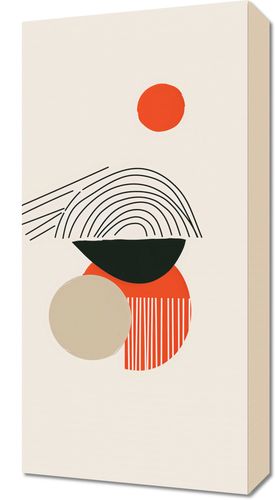 Obraz z serii boho zatytułowany Centralne Słońce to dzieło artystyczne utrzymane w stonowanej palecie kolorystycznej, na którym dominują geometryczne kształty i linie. Na górnej części kompozycji widnieje małe, jaskrawe czerwone koło, które może symbolizować słońce lub inny punkt centralny. Poniżej znajduje się czarna, półokrągła forma z koncentrycznymi liniami, przypominającymi ułożenie naturalnych warstw kamienia lub drzewa. Tuż obok, kontrastujące z nią, znajduje się większe, jasno beżowe koło, które wraz z czarnym półkolem tworzy iluzję przestrzeni. Na dole obrazu uwagę przyciąga większe, okrągłe pole w odcieniu ciepłego pomarańczu, na którym znajduje się wzór pasków w kierunku pionowym, dodający tekstury i ruchu. Całość utrzymana jest w estetyce minimalizmu i modernizmu, gdzie każdy element, choć prosty, jest starannie wyważony, by współgrać z resztą kompozycji.