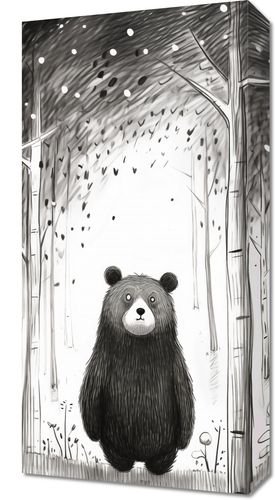 Obraz z serii wnętrza zatytułowany Ciekawski Miś. Ten uroczy obraz ilustracyjny przedstawia przyjaznego, czarno-białego misia stojącego na dwóch nogach w środku leśnej polany, patrzącego z ciekawością w górę na delikatnie opadające płatki śniegu. Stylizowany na rysunek piórkiem z miękkimi odcieniami szarości, wprowadza atmosferę spokoju i zaciekawienia naturą. Idealny do ozdoby pokoju dziecięcego, jako element dekoracyjny w przestrzeniach edukacyjnych lub jako ciepły akcent w domowych salonach.