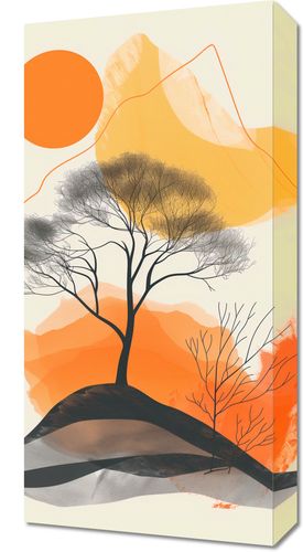 Obraz z serii abstrakcja zatytułowany Drzewo Na Przestrzeni. Na plakacie widnieje artystyczna interpretacja pejzażu, w której dominują ciepłe, pastelowe barwy. Centralnym punktem kompozycji jest samotne, rozłożyste drzewo o szczegółowo wyrysowanych, delikatnych gałęziach, które kontrastuje z bardziej abstrakcyjnymi, płynnymi formami w tle. Mniejsze, gołe drzewko w dolnej części obrazu wprowadza dodatkowy element perspektywy i głębi. Tło jest połączeniem geometrycznych i organicznych kształtów, z dużym, okrągłym słońcem i abstrakcyjnymi formami przypominającymi wzgórza. Kolorystyka obrazu składa się z odcieni żółci, pomarańczu i szarości, co nadaje plakatowi ciepły, spokojny nastrój. Ten obraz mógłby być idealny do wnętrz, gdzie chcemy wprowadzić element spokoju i harmonii z naturą.