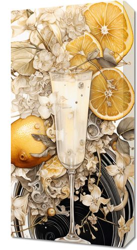 Obraz z serii wnętrza zatytułowany Esencja Cytrusów. Zmysłowy pejzaż ukazuje krystaliczną szampanową kieliszek otoczony bujnym kwiatem i soczystymi plasterkami cytryny. Delikatne białe kwiaty i misternie rysowane detale dodają kompozycji głębi i subtelności, podczas gdy wyraziste żółte akcenty cytryny dodają energii i świeżości. Całość wprowadza w stan relaksu i orzeźwienia, przypominając o chwilach spędzonych na letnich tarasach. Idealnie wpasuje się w eleganckie restauracje, bary koktajlowe lub nowoczesne kawiarnie z akcentami śródziemnomorskimi.