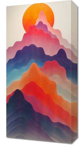 Obraz z serii abstrakcja zatytułowany Gama Gór to stylizowane przedstawienie majestatycznych gór, które tworzą warstwowe pasmo kolorów od głębokiego fioletu poprzez róż, czerwień, aż po ciepłe odcienie pomarańczu i żółci. Ta abstrakcyjna interpretacja krajobrazu górskiego z dużym, słońcem w odcieniach intensywnego pomarańcza w tle, nadaje dziełu atmosferę spokoju i medytacyjnej głębi. Delikatne tekstury i przejścia tonalne między warstwami nadają ilustracji poczucie trójwymiarowości i dynamiki. Obraz idealnie komponuje się z przestrzeniami, które cenią sobie naturę i spokój, nadając wnętrzom charakteru i głębi, doskonały do salonów, przestrzeni wellness, pokojów medytacyjnych lub jako akcent w nowoczesnych biurach.