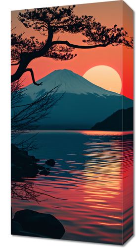 Obraz z serii motywy wschodnie zatytułowany Góra Wieczorem. Urokliwe przedstawienie ikonicznej góry o zachodzie słońca, gdzie ciepłe odcienie czerwieni i pomarańczy rozlewają się po niebie i wodnej tafli, tworząc lustrzane odbicie. Sylwetka drzewa i góry na tle zachodzącego słońca wprowadzają atmosferę zen i wewnętrznej równowagi. Idealny dla miłośników estetyki wabi-sabi i minimalizmu, doskonale wpasuje się w nowoczesne wnętrza, a także wszędzie tam, gdzie pragnie się wprowadzić element uspokajającej natury.