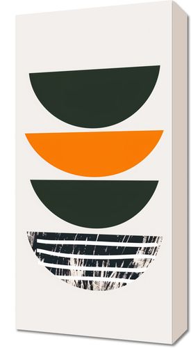 Obraz z serii boho zatytułowany Gra Tekstur to połączenie czystych, geometrycznych form z wyrazistą grą tekstur. Trzy półkoliste kształty w odcieniach głębokiej zieleni i żywej pomarańczy są ułożone w precyzyjny stos, tworząc zaskakującą głębię i zmysłową symetrię. Najniższa forma przerywa ten porządek, wprowadzając do dzieła dynamiczne, surowe detale, przypominające efekt artystycznego, spontanicznego malowania lub drapowania. Ten obraz jest idealnym wyborem dla wnętrz, które doceniają silne, graficzne elementy oraz surowy, industrialny klimat, pasując zarówno do minimalistycznych, jak i bardziej eklektycznych przestrzeni.