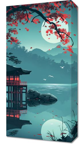 Obraz z serii motywy wschodnie zatytułowany Japoński Pawilon. Ten obraz emanuje spokojem dzięki scenie przedstawiającej tradycyjny japoński pawilon, otoczony przez wodę i delikatnie pochylające się czerwone liście klonu. Ciepłe światło wschodzącego księżyca i subtelne odbicie w wodzie podkreślają atmosferę ciszy i refleksji. Delikatne sylwetki przelatujących ptaków dodają element życia i ruchu. Obraz ten idealnie wpisuje się w przestrzenie współczesne, minimalistyczne, a także te, które celebrują naturę i spokój, takie jak pokoje do medytacji, jadalnie, czy też poczekalnie w spa.