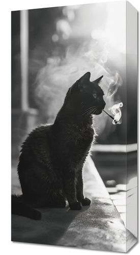 Obraz z serii wnętrza zatytułowany Kocia Przerwa. Na tym obrazie uwieczniono czarnego kota siedzącego na krawędzi, zanurzonego w promieniach rozproszonego światła, które podkreślają jego błyszczącą sierść i wyraziste kontury. Kocie wąsy delikatnie zarysowane w kontraście ze światłem nadają mu wyrazistości, a unoszący się dym tworzy aurę tajemniczości. Jest to obraz zarówno elegancki, jak i zagadkowy, idealny dla miłośników zwierząt i minimalistycznego designu. Obraz ten będzie pasował do każdego wnętrza, od klasycznego po nowoczesne, dodając subtelnego charakteru i spokoju.