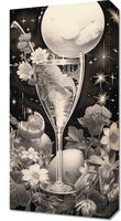 Obraz z serii wnętrza zatytułowany Kosmiczny Eliksir. Niesamowita kompozycja przedstawiająca kieliszek, z którego wylewa się galaktyczny nektar, otoczony kwiatami i roślinami w monochromatycznych barwach. Centralnym punktem jest lśniąca pełnia księżyca, której blask odbija się w szkle, tworząc atmosferę tajemnicy i magii. Gwiazdy migoczą w tle, nadając całości głębokiego, nieskończonego wymiaru. Delikatne linie i szczegóły graficzne wzbogacają kompozycję, czyniąc ją idealnym wyborem do nowoczesnych salonów, galerii sztuki oraz miejsc o tematyce astronomicznej.