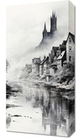 Obraz z serii pejzaże zatytułowany Mglisty Refleks. Misterne pociągnięcia pędzla przedstawiają starą wieś schowaną w mrocznych zakątkach gór, z dominującymi wieżami kościoła wznoszącymi się nad nią. Mgła otulająca krajobraz i odbicie w spokojnej wodzie tworzą atmosferę tajemniczości i zadumy. Monochromatyczna paleta barw dodaje głębi i intensywności całemu obrazowi, czyniąc go idealnym wyborem dla klasycznych salonów oraz miejsc takich jak kawiarnie o historycznym charakterze czy ekskluzywne kluby dyskusyjne.