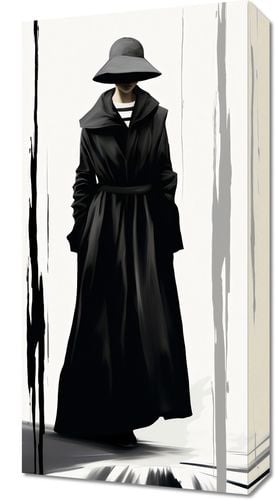 Obraz z serii wnętrza zatytułowany Mroczna Taina. Enigmatyczna postać w czarnym płaszczu i szerokim kapeluszu ukrywa swoją tożsamość, podkreślając aura tajemniczości. Czarno-białe tło z pionowymi smugami przypominającymi deszcz lub płynący atrament dodaje głębi i dramatyzmu kompozycji. Subtelne niuanse światła i cienia grają na powierzchni płaszcza, tworząc atmosferę intrygi i nieokreślonego niebezpieczeństwa. Świetnie sprawdzi się w nowoczesnych galeriach sztuki, luksusowych hotelach o minimalistycznym designie oraz w przestrzeniach przeznaczonych dla miłośników noir i kryminałów.