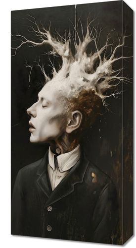 Obraz z serii abstrakcja zatytułowany Myśli Wzrastające prezentuje surrealistyczny portret mężczyzny, z którego głowy wyłania się skomplikowana struktura przypominająca korzenie lub gałęzie drzewa. Ten organiczny koronament wyrasta z myśli postaci, symbolizując rozwój, kreatywność i złożoność ludzkiego umysłu. Kontrast między żywą bielą i szarościami struktury a głębokim, ciemnym tłem sugeruje głębię i intensywność wewnętrznego świata postaci. Ten obraz może stanowić mocny wizualny akcent w przestrzeniach takich jak galerie, artystyczne pracownie, gabinety psychologiczne, a także we wnętrzach osób ceniących głębokie, filozoficzne refleksje.