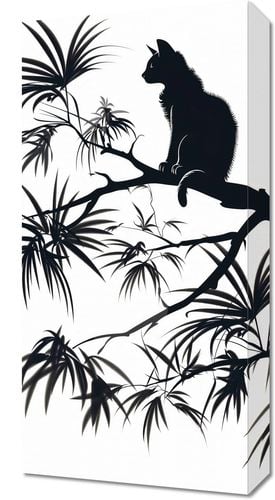 Obraz z serii wnętrza zatytułowany Na Gałęzi przedstawia sylwetkę kota siedzącego na gałęzi, zarysowaną na tle jasnego, jednolitego tła. Całość kompozycji utrzymana jest w stylu sumi-e, nawiązującym do tradycyjnej wschodniej techniki tuszem. Kontury kota i roślin są wyraziste, z delikatnymi szczegółami, które przywodzą na myśl efekt cieniowania i głębi. W tle roślinność, prawdopodobnie bambus lub tropikalne palmy, jest przedstawiona w sposób stonowany, co wskazuje na użycie gradientu cieni. Grafika ta oddaje spokój i harmonię, charakterystyczne dla azjatyckiej estetyki i sztuki. Idealnie nadawałaby się jako dekoracja w przestrzeniach inspirowanych minimalizmem i naturą.