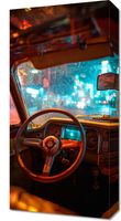 Obraz z serii pop art zatytułowany Nocny Kierowca, przedstawia widok z wnętrza klasycznego samochodu, patrząc przez deszczową, skraplaną szybę na rozświetlone neony miejskiego pejzażu nocą. Ciepłe, czerwone oświetlenie wnętrza samochodu kontrastuje z hipnotyzującym błękitem i elektrycznymi odcieniami świateł zewnętrznych, tworząc intymną, a jednocześnie dynamiczną atmosferę. Kropelki deszczu na szybie dodają tekstury i głębi, sprawiając, że scena jest zarówno realistyczna, jak i liryczna. To dzieło sztuki mogłoby znaleźć swoje miejsce w przestrzeniach nowoczesnych, miejskich loftów lub jako akcent w barze o tematyce retro, wprowadzając element tajemniczości i miejskiego romansu.