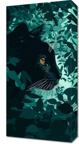 Obraz z serii wnętrza Oczekiwanie, przedstawia portret czarnego kota wtapiającego się w zielone liście. Artysta użył bogatej palety odcieni zieleni, aby stworzyć iluzję kota skrytego w gęstym listowiu, z wyraźnym, żółtym okiem, które przyciąga uwagę i daje wrażenie czujności i tajemniczości. Złożoność wzoru liści kontrastuje z prostotą cienia kota, co nadaje dziełu głębi i wielowymiarowości. Ten obraz byłby idealnym dodatkiem do każdego współczesnego wnętrza, które ceni subtelność i naturę, a także może być interesującym punktem centralnym w galerii sztuki lub przestrzeni wystawienniczej.