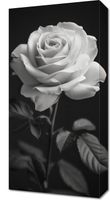 Obraz z serii wnętrza zatytułowany Płatki Róż. Obraz przedstawia ponadczasowy, monochromatyczny obraz róży. Róża, z delikatnymi i szczegółowymi płatkami, jest wyeksponowana na ciemnym tle, co wyostrza jej obrys i podkreśla subtelne niuanse jej formy. Gra światła i cienia nadaje głębi i trójwymiarowości, a ułożenie płatków w pełnym rozkwicie symbolizuje piękno i doskonałość. Liście i łodyga są skromne, ale wyraźne, dodając naturalności całej kompozycji. Obraz oddaje esencję delikatności i elegancji róży, co sprawia, że jest idealny dla każdego, kto szuka elementu dekoracyjnego o subtelnym pięknie i spokojnej, relaksującej estetyce.
