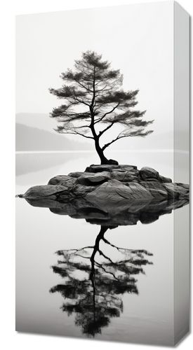 Obraz z serii pejzaże zatytułowany Samotne Drzewo to monochromatyczne zdjęcie prezentujące unikalną scenę – pojedyncze drzewo wyłaniające się z kamiennej wysepki na tle spokojnej, lustrzanej powierzchni wody. Obraz jest ujęciem w tonacji czerni i bieli, co nadaje mu ponadczasowy charakter i podkreśla minimalistyczną estetykę. Silny kontrast między ciemnymi konturami drzewa a jasnym tłem wody tworzy głębię i przykuwa uwagę. Odbicie drzewa w wodzie tworzy symetryczny i spokojny obraz, który może wnosić element spokoju i zamyślenia do każdego otoczenia. Ten obraz będzie doskonałym wyborem dla osób ceniących naturę, minimalizm oraz sztukę fotograficzną, idealny do powieszenia w salonie, biurze, czy jako element dekoracyjny w przestrzeniach wellness i spa.