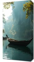 Obraz z serii pejzaże zatytułowany Samotność na Tafli przedstawia idylliczny krajobraz, w którym centralnym punktem jest drewniana łódka unosząca się na spokojnych wodach jeziora. Otoczona przez majestatyczne, zielone drzewa i klify, które otulają wodę jak opiekuńcze ramiona, scena ta jest utrzymana w ciepłych, naturalnych barwach. Promienie słoneczne przebijają się przez liście, tworząc efekt tajemniczego światła i cieni na wodnej tafli. Całość kompozycji wywołuje uczucie spokoju i kontemplacji, idealnie oddając atmosferę zacisznego zakątka, oderwanego od zgiełku codzienności. Obraz ten będzie pasował do wnętrz, które pragną podkreślić łączność z naturą i stworzyć oazę spokoju, takich jak gabinety relaksacyjne, pokoje medytacyjne czy nawet jako spokojny akcent w nowoczesnych biurach.