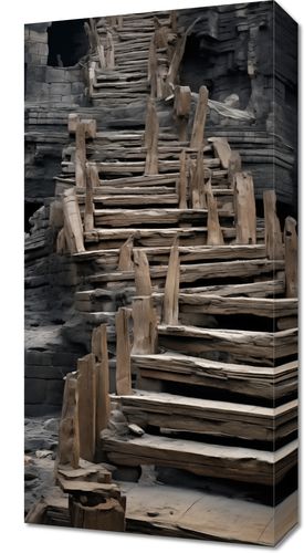 Obraz z serii pejzaże zatytułowany Schody do Nieznanego. Ten tajemniczy i intrygujący obraz przedstawia prymitywne, drewniane schody prowadzące w górę przez strukturę przypominającą starożytną ruiny lub naturalne formacje skalne. Zanurzone w półmroku, schody te wydają się zapraszać odkrywców do podjęcia podróży w nieznane, pełnej nieoczekiwanych odkryć. Obraz ten idealnie oddaje uczucie odkrycia i przygody, idealny dla przestrzeni zainspirowanych historią, naturą, czy literaturą eksploracyjną. Może stanowić inspirujący element w domach, biurach, a także w przestrzeniach publicznych takich jak kawiarnie tematyczne lub księgarnie.