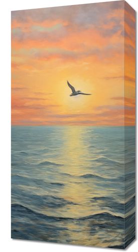 Obraz z serii pejzaże zatytułowany Serenada Nieba. Ten olśniewający obraz przedstawia moment, gdy ostatnie promienie dnia malują niebo w odcienie pomarańczy i różu, a pojedynczy ptak szybuje w stronę zachodzącego słońca. Morze rozciąga się aż po horyzont, odbijając złote światło, które nadaje scenie poczucie nieskończoności i spokoju. Doskonale nadaje się do wnętrz, które aspirują do stworzenia atmosfery spokoju i refleksji, takich jak salony, pokoje wypoczynkowe, czy przestrzenie wellness i spa.