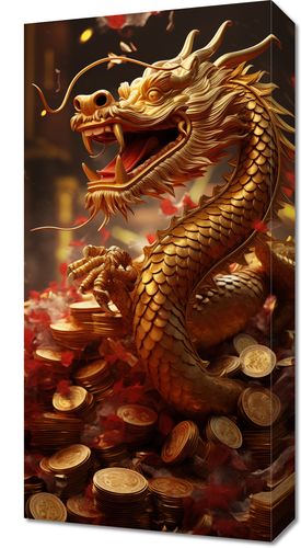 Obraz z serii motywy wschodnie zatytułowany Smok Bogactwa. Ilustracja ta ukazuje potężnego złotego smoka, symbol siły i pomyślności w wielu kulturach wschodnich, unoszącego się nad skarbami. Smok, z szeroko otwartymi szczękami, wydaje się ryczeć triumfalnie, otoczony przez wirujące złote monety i kwiaty, co dodaje kompozycji dynamizmu. Żywe kolory i szczegółowe wykonanie smoka sprawiają, że obraz jest pełen życia i energii. Obraz ten jest doskonałym wyborem dla miłośników sztuki orientalnej oraz jako element dekoracyjny wnętrz, które chcą wprowadzić elementy bogatej symboliki i kulturowej głębi, takich jak domowe biura, pokoje do medytacji czy ekskluzywne salony.