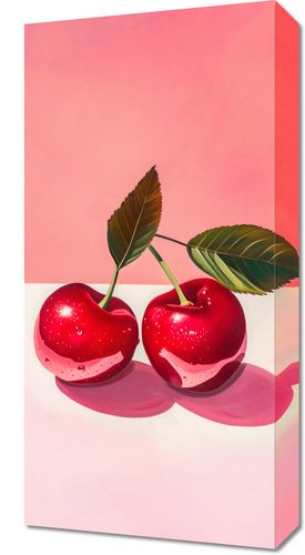 Obraz z serii wnętrza zatytułowany Soczyste Oczywiste ukazuje dwa soczyste, lśniące wiśnie z dwoma zielonymi liśćmi, które są połączone w jedną gałązkę, na pastelowym różowym tle z białą powierzchnią, na której odbijają się owoce. Wiśnie są przedstawione w realistycznym stylu, z widocznymi refleksami światła i kroplami wody, co nadaje im świeży i apetyczny wygląd. Zastosowanie cieni i światłocienia nadaje kompozycji głębi i trójwymiarowości. Dominujące ciepłe odcienie różu i czerwieni tworzą przyjemną i słodką atmosferę. Obraz może być interpretowany jako celebracja lata i dojrzałych owoców lub jako minimalistyczne podejście do tematu natury morte w nowoczesnym wydaniu. Idealnie nadawałby się jako element dekoracyjny do kuchni lub jadalni, wprowadzając żywy i kolorowy akcent.