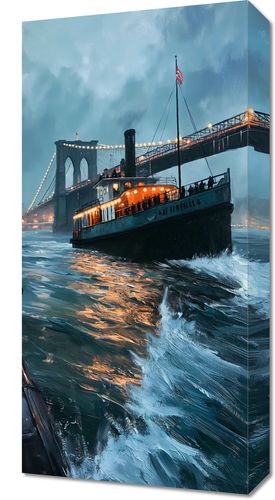 Obraz z serii abstrakcja zatytułowany Stary Parowiec uchwycił nostalgiczny obraz starego parowca przemierzającego wody przy mrocznym niebie, z tłem rozświetlonego mostu. Światła na parowcu rzucają ciepły blask na fale, tworząc złoty refleks na powierzchni wody, co kontrastuje z chłodnymi odcieniami burzowych chmur i zmierzchu. To malownicze przedstawienie, połączone z dynamiczną grą świateł i cieni, tworzy romantyczną i pełną atmosfery scenę, która przyciąga oko i wywołuje uczucie sentymentu do dawnych czasów. Idealnie nadaje się do zawieszenia w przestrzeniach, gdzie chcemy dodać element historycznej elegancji i marzycielskiego nastroju, takich jak biblioteki, studia, a nawet salony.