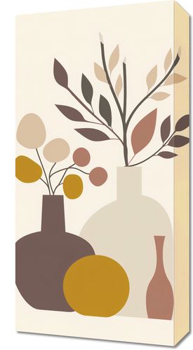 Obraz z serii minimalistyczne zatytułowany Stonowane Naturmorta. Artystyczne przedstawienie klasycznego naturmorta ożywione zostało poprzez minimalistyczne kształty i spokojną paletę barw. Butelki i wazy o prostych formach, wypełnione są stonowanymi okręgami i liśćmi, które przypominają delikatne kompozycje florystyczne. Barwy ziemi – od ciepłych beżów po głębokie brązy – są połączone z subtelnością, tworząc wyrafinowany i spokojny nastrój.Ten obraz doskonale wpisze się w dekorację nowoczesnych, stonowanych wnętrz, gdzie jego elegancja i subtelność mogą być w pełni docenione. Idealny do umieszczenia w salonie, sypialni lub biurze, doda każdemu z tych miejsc ciepła i domowej atmosfery, zachowując przy tym czystość i prostotę linii.