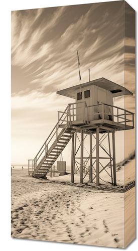 Obraz z serii pejzaże zatytułowany Strażnik Wydm. Prezentuje on sepiową scenę z wieżą ratownika na pustej plaży. Nostalgiczna tonacja obrazu podkreśla samotność struktury i piękno otaczającej ją dzikiej przyrody. Dramatyczne chmury na niebie i ślady na piasku prowadzą wzrok ku wieży, dodając głębi i historii miejscu. Ten obraz idealnie nadaje się do wnętrz, w których pragnie się wywołać uczucie spokoju, przestrzeni i czasów minionych, takich jak salony, pokoje wypoczynkowe, a także przestrzenie publiczne lub prywatne biura, które cenią sobie klasyczny wygląd i atmosferę.