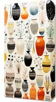 Obraz z serii wnętrza zatytułowany Symfonia Wazonów. Wspaniałe wazony w bogatej palecie kolorów, od głębokiej czerni do ciepłych odcieni pomarańczu, tworzą intrygującą mozaikę wzorów i kształtów. Delikatne motywy roślinne, które zdobią niektóre wazony, dodają uroku i lekkości, a różnorodność wzorów i faktur przyciąga wzrok i zaprasza do głębszej refleksji. Kontrast między jasnymi i ciemnymi barwami, a także subtelne niuanse w każdym wazonie, dodają tej kompozycji głębi i dramatu. Ten artystyczny plakat doskonale wpisuje się w klimat wyrafinowanych galerii sztuki, eleganckich kawiarni oraz nowoczesnych przestrzeni mieszkalnych, które stawiają na unikatowy design.
