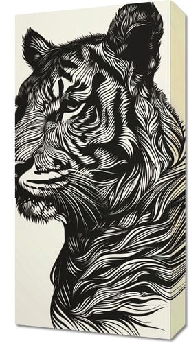 Obraz z serii wnętrza zatytułowany Tygrysi Gwizd. Ta dramatyczna grafika przedstawia tygrysa w stylu linorytu, z wyraźnymi, płynnymi liniami układającymi się w złożony wzór futra. Monochromatyczna paleta, z ciemnymi i jasnymi odcieniami na neutralnym tle, podkreśla majestatyczną postawę i intensywny wzrok tego dzikiego zwierzęcia. Obraz emanuje siłą i elegancją, oddając w pełni królewski charakter tygrysa. Idealny do wnętrz urządzonych w stylu minimalistycznym lub nowoczesnym, będzie także pasował do przestrzeni, które chcą podkreślić motywy przyrodnicze lub eksplorować tematykę ochrony dzikiej przyrody.