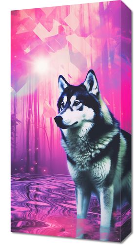 Obraz z serii pop art zatytułowany Wilczy Duch. Ta hipnotyzująca grafika łączy w sobie realistyczny wizerunek wilka z eterycznym, neonowym lasem w tle, co nadaje scenie onirycznego, mistycznego charakteru. Wilk, przedstawiony w pełnym majestacie, stoi na brzegu zaczarowanego jeziora, a tajemnicze, geometryczne kształty unoszą się w powietrzu, dodając kompozycji elementu fantastyki. Wyraziste kolory różu i fioletu tworzą niemal bajkową atmosferę. Obraz jest idealnym wyborem dla miłośników natury i jej mistycznych aspektów, świetnie nadaje się do wnętrz o tematyce przyrodniczej, pokojów dla młodzieży, lub jako unikatowy element dekoracyjny w przestrzeniach współczesnych.