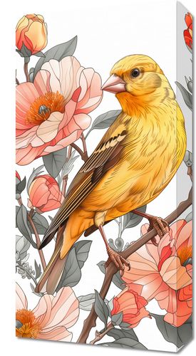 Obraz z serii natura zatytułowany Wiosenny Śpiewaczek przedstawia pełną detali i życia scenę, w której jaskrawo żółty ptak, przypominający kanarka, spoczywa na gałęzi wśród kwitnących kwiatów. Delikatne i subtelne kolory kwiatów w pastelowych odcieniach różu i pomarańczu tworzą miękki kontrast do żywego upierzenia ptaka. Precyzyjne linie i staranne cieniowanie nadają ilustracji realistycznego wyglądu, a roślinność w tle jest równie szczegółowo wykonana, co dodaje kompozycji głębi i bogactwa. Ten obraz to celebracja wiosennego odrodzenia i piękna natury, idealny do ożywienia każdego wnętrza, szczególnie pokoju dziennego, przestrzeni odpoczynkowej lub kawiarni o przytulnej atmosferze.