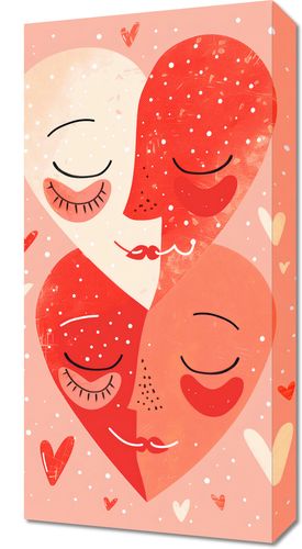 Obraz z serii wnętrza zatytułowany Wysoka Wibracja przedstawia dwie połówki serca, które razem tworzą jedno, gdzie każda połówka ma ludzkie rysy twarzy z zamkniętymi oczami, wyrażającymi spokój i radość. Całość utrzymana jest w ciepłej, pastelowej kolorystyce z akcentami czerwieni i różu, a tło wypełniają delikatne elementy w kształcie serduszek, które dodają ilustracji romantycznego nastroju. Obraz symbolizuje jedność, miłość i harmonię, a zamknięte oczy mogą sugerować intymność i zaufanie. Obraz jest idealnym wyrazem miłości i bycia w związku, doskonałym do pomieszczeń domowych, takich jak sypialnie czy salony, a także może stanowić romantyczny prezent dla bliskiej osoby.