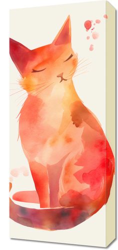 Obraz z serii wnętrza zatytułowany Akwarelowy Kot przedstawia akwarelową ilustrację spokojnego, zamyślonego kota. Kot zamyka oczy w zadowoleniu, a jego sylwetka płynnie przechodzi w bogatą paletę ciepłych odcieni czerwieni i pomarańczu, co nadaje dziełu wrażenie spokoju i ciepła. Delikatne plamy i rozmycia barw typowe dla akwareli tworzą wrażenie lekkości i przestrzeni, a jednocześnie podkreślają łagodność i spokojny nastrój obrazu. Jest to doskonały wybór dla tych, którzy pragną wprowadzić do swojego domu element relaksu i spokoju. Obraz ten idealnie wpasuje się w przestrzeń taką jak przytulna kawiarnia, zakątek do czytania w domowej biblioteczce lub pokój dziecinny, gdzie może inspirować do spokojnego snu i odpoczynku.