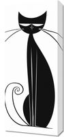 Obraz z serii abstrakcja zatytułowany Czerń Kocicy. Przedstawia minimalistyczną, stylizowaną ilustrację czarnego kota. Postać kota charakteryzuje się wydłużonym, smukłym ciałem z długimi, subtelnymi liniami, które tworzą elegancką i uproszczoną formę. Kot posiada duże, wyraziste oczy i długie wąsy, które dodają mu charakteru, a zakrzywiony ogon w kształcie spirali dodaje dynamiki kompozycji. Całość jest utrzymana w czarno-białej kolorystyce, co nadaje projektowi nowoczesnego i wyrafinowanego wyglądu. Obraz ten idealnie sprawdzi się jako dekoracja w nowoczesnych wnętrzach, wprowadzając element zaskakującej prostoty i elegancji.